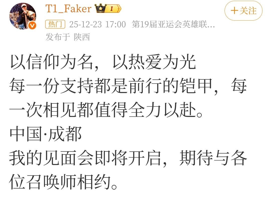近期,Faker在个人社交平台发布消息,宣布将于2025年12月31日在成都举办个人见面会。他以充满情感的文字写道:“以信仰为名,以热爱为光……我的见面会即将开启,期待与各位召唤师相约。”这一消息迅速点燃了粉丝的热情但也引来了质疑!