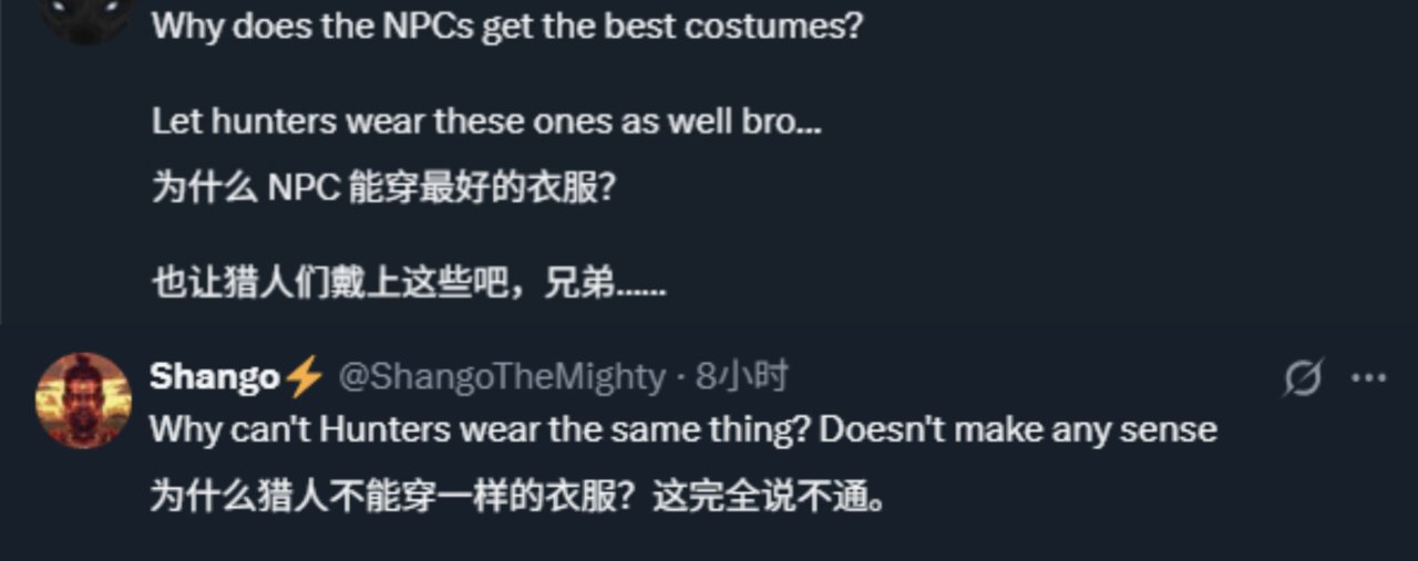 游戏中的关键NPC阿尔玛、埃里克和杰玛都换上了酷似鹭鹰龙的羽毛装扮,被玩家戏称为“鸟人”。这些高度拟真化的羽毛服饰在人类角色身上显得格外突兀,有玩家直接质疑:“为什么猎人不能穿一样的衣服?”部分玩家在社交媒体上表达了对游戏现状的不满,认为此举是游戏内容匮乏背景下,卡普空开始向“福瑞”方向发展的表现。