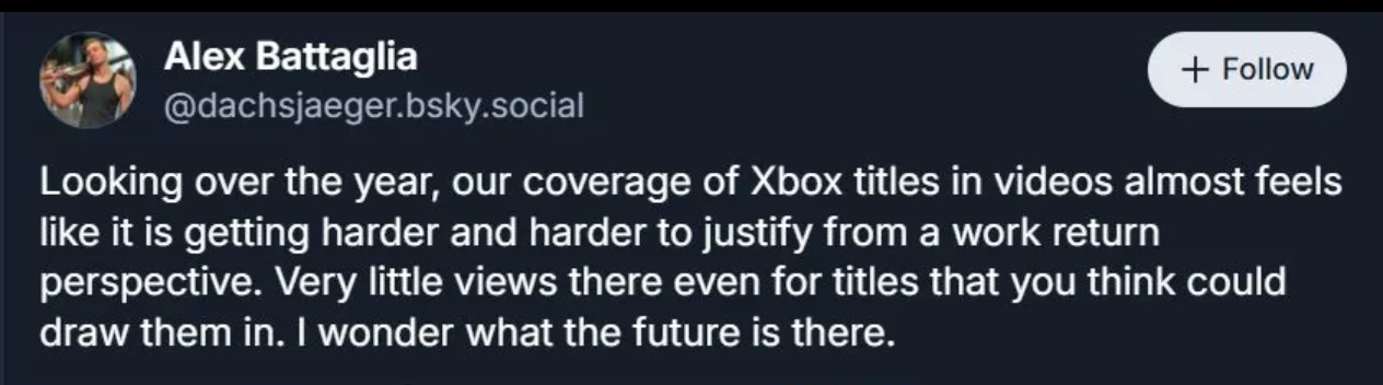 知名游戏技术分析媒体Digital Foundry(数毛社)技术分析师Alex Battaglia近日透露,2025年该频道制作的Xbox游戏分析视频观看量持续低迷,甚至那些原本被认为能吸引Xbox玩家关注的游戏内容也未能产生足够影响力。