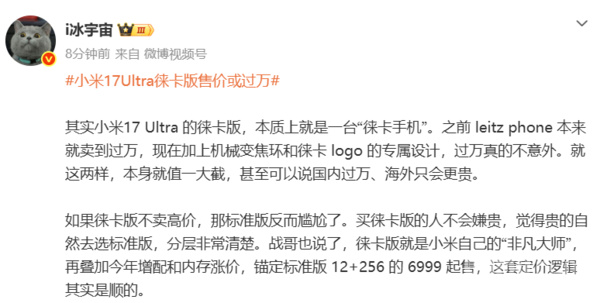 該博主補充道:如果小米17 Ultra徠卡版不設定高價,標準版將陷入尷尬境地。購買徠卡版的消費者通常不會對價格敏感,而覺得價格偏高的人自然會選擇標準版。