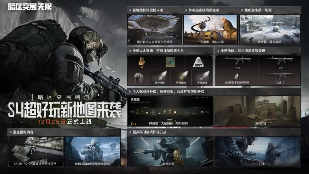 感谢您对《暗区突围:无限》的支持与热爱,S4赛季【晨昏线】详细更新内容如下: