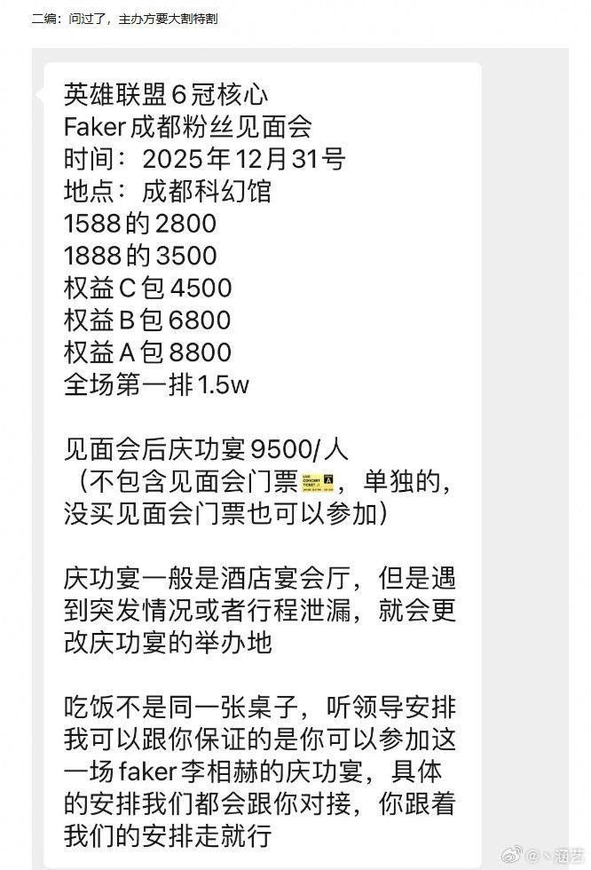 更引人关注的是,黄牛公然兜售见面会后的庆功宴资格,标价9500元/人。但高价背后却有苛刻条款:明确标注“非同桌就餐”,参与者可能只是在隔壁桌远远观看Faker吃饭,且需“听从领导安排”,地点也可能临时变更。对此,粉丝纷纷吐槽,让生活节俭、连请队友喝可乐都要斟酌的Faker参与此类高价商业活动,与其一贯人设严重违和。