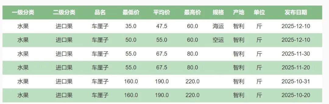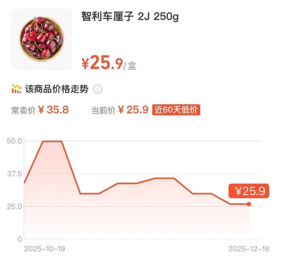 然而进入今年下半年的12月份,进口车厘子的平均进口价格已经只有两个月前的四分之一了,尤其是在进入11月底后价格不断探底。