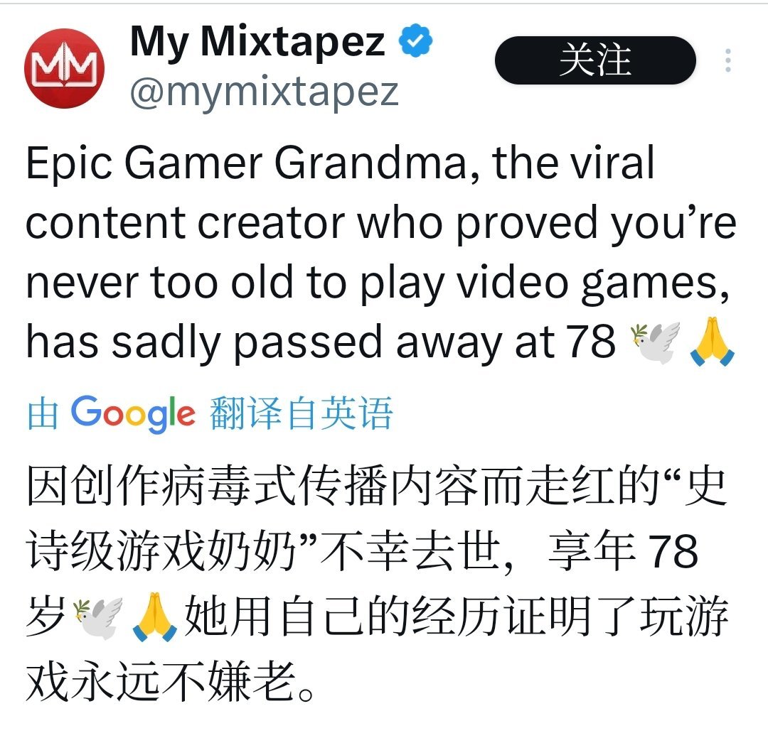 Epic Gamer Grandma,本名阿格妮絲,是一位來自蘇格蘭的知名高齡網紅,以其在TikTok平臺上的遊戲相關內容而聞名。她於2025年12月21日安詳離世,享年78歲。這則消息於12月24日在她的頻道和Instagram上公佈,迅速引發全球粉絲的哀悼和緬懷。作爲一個在以年輕人爲主的社交平臺上脫穎而出的“奶奶級”創作者,她的獨特魅力在於將遊戲文化與老年生活巧妙融合,證明了“遊戲無年齡限制”的理念。