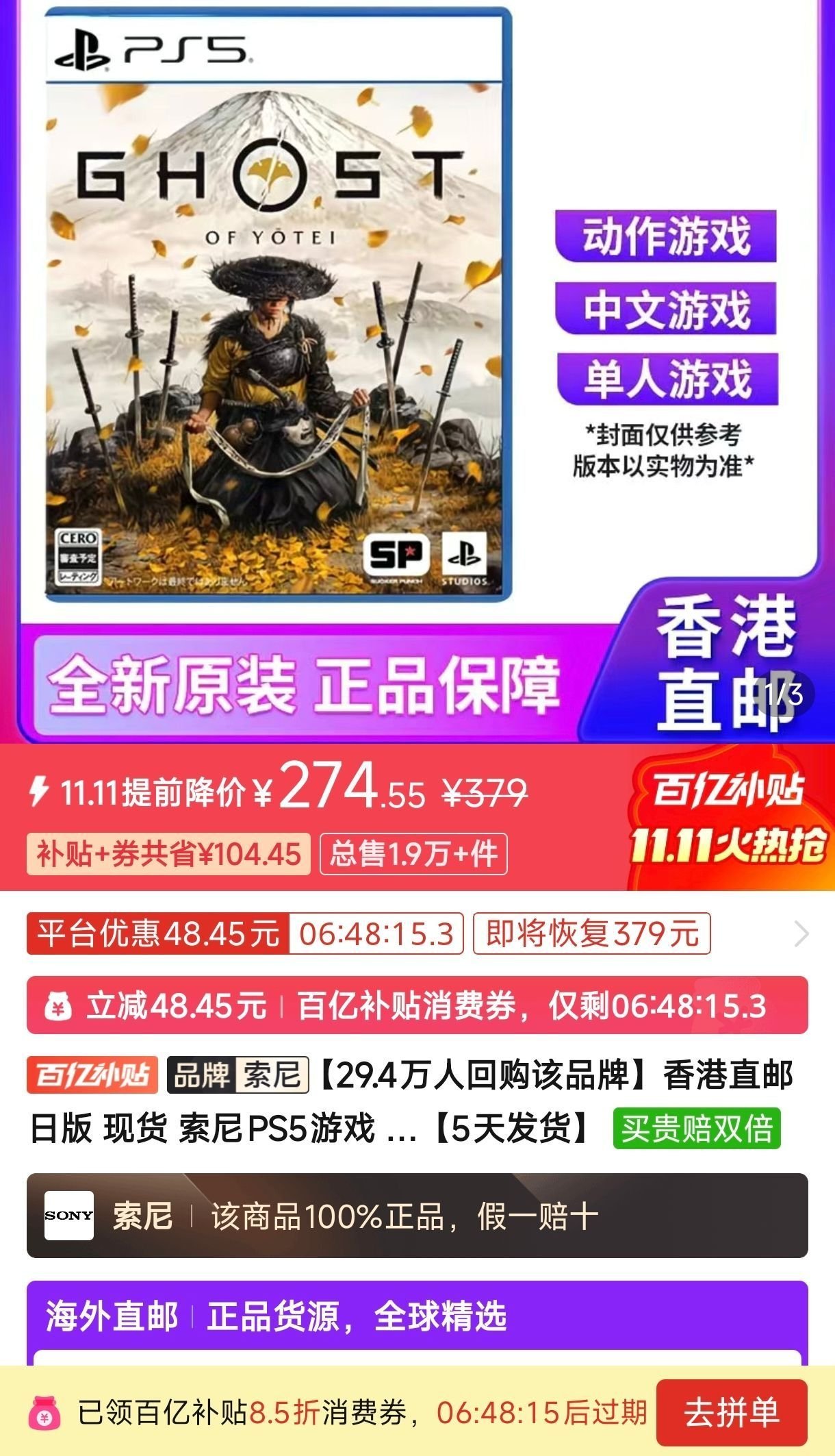 目前拼多多百億補貼平臺的《羊蹄山之魂》PS5實體盤價格居然出現反彈,此前274.5元的史低價已成爲過去。