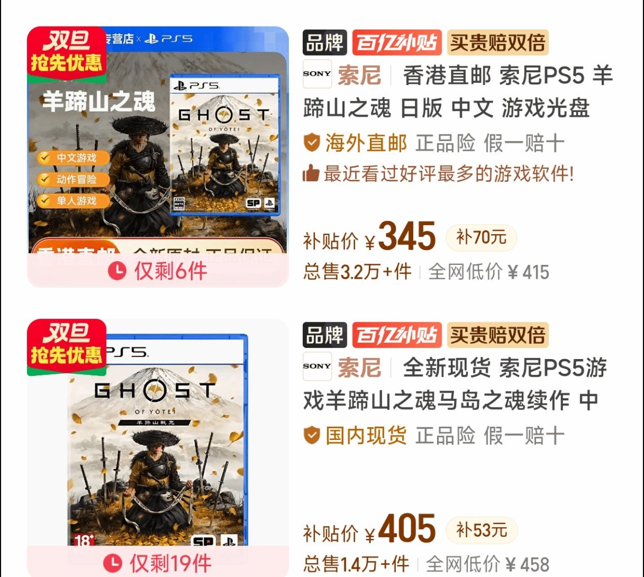 截至12月24日,該遊戲日版光盤的最低價已回升至341元,相較於11月4日的史低價274.5元,漲幅超過24%。而港臺版光盤價格更高,達到405元。這款由Sucker Punch開發的PS5獨佔大作自10月2日發售後,實體版價格一度快速下滑,曾在10月底至11月初出現288元乃至274.5元的低價。目前價格的意外回升引發市場關注,有分析認爲這可能與遊戲持續良好的市場表現和口碑有關。