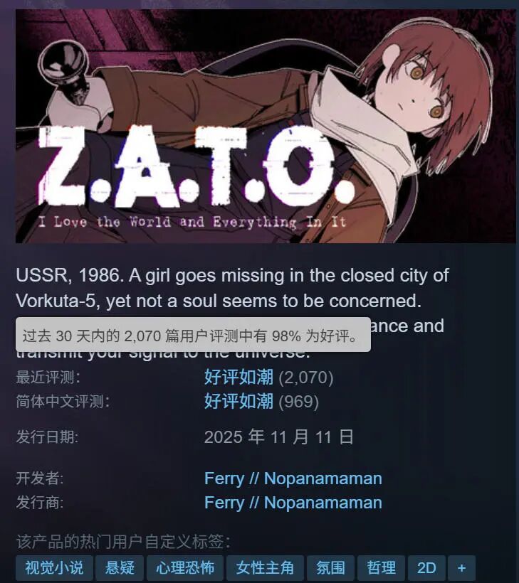 《Z.A.T.O.》是部視覺小說,從頭到尾沒有選項,所以你可以說它其實沒有可玩性。但它又很獨特,從其98%的Steam好評率來看,許多人都能認可它的獨特。
