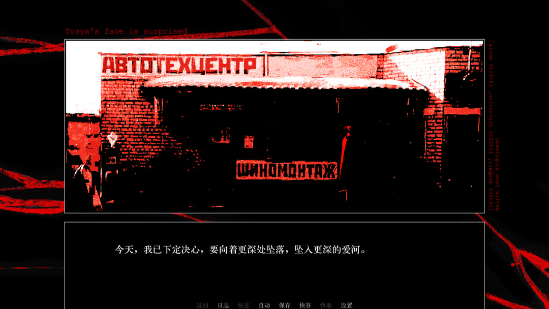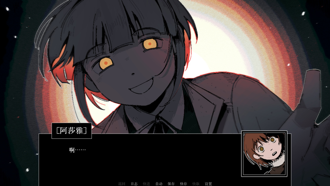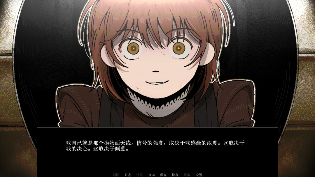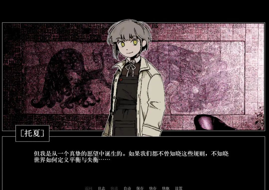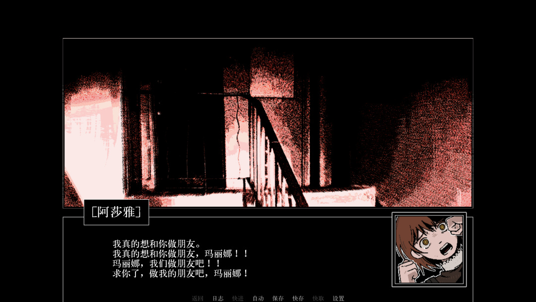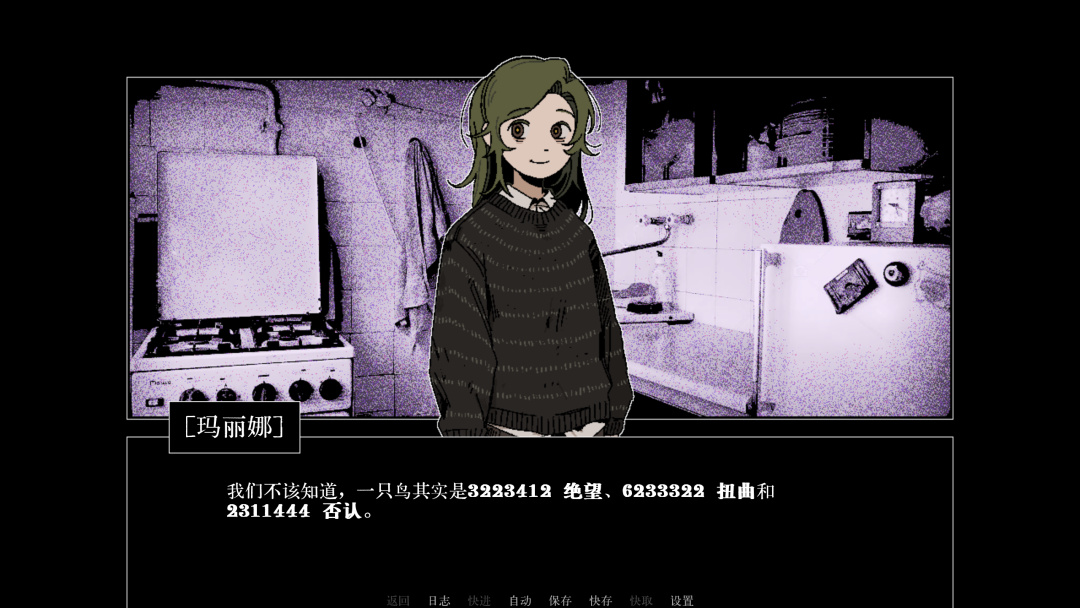 在一些地方,你還能看到視覺小說常見的文字遊戲。比如當女主的精神脫軌時,手動播放會強制變成自動播放,然後一切崩壞。在部分地方,還會出現很濃郁的文字恐怖谷效應——沒錯,這遊戲有一點恐怖色彩。