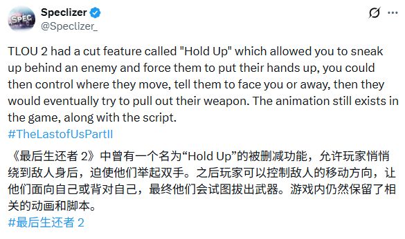 模组制作者Speclizer披露,顽皮狗原本在《最后生还者2》中设计了"挟持"功能但最终删除,目前他正尝试为PC版重新实现该机制。尽管游戏发售已逾五年,玩家仍在发掘新内容。据其透露,该功能允许艾莉从背后挟持敌人,令其举手投降并控制其移动方向与面向,最终敌人会尝试拔枪反击。