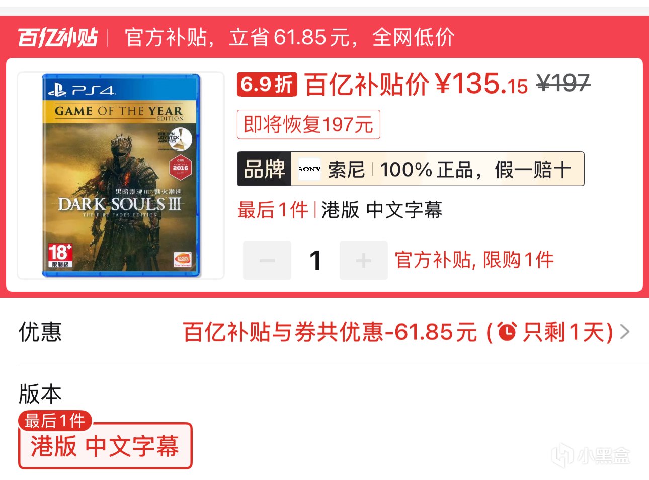 3.PS4港版中文游戏《黑暗之魂3年度版》135.15元全新包邮,PS5主机运行该PS4游戏可以稳定60帧。