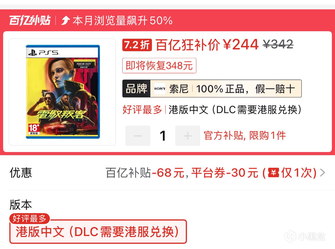 2.PS5港版中文游戏《赛博朋克2077》244元全新包邮。