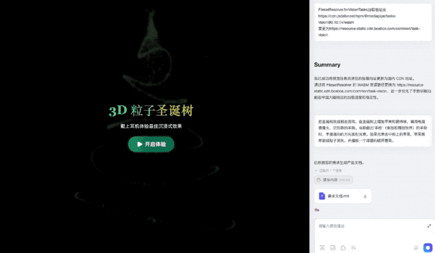 該說不說,在簡單的聖誕樹上直接改交互邏輯,這顯然是個大活兒,不過秒噠也馬上反應過來這是要大改。面對類似這種需求,它會馬上幫你生成它理解的完整需求文檔。