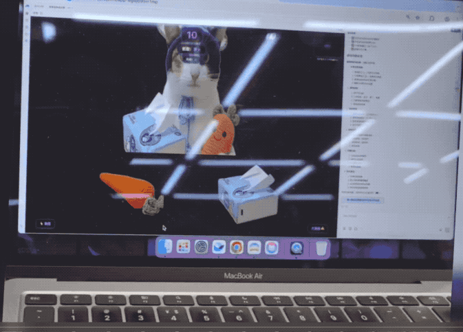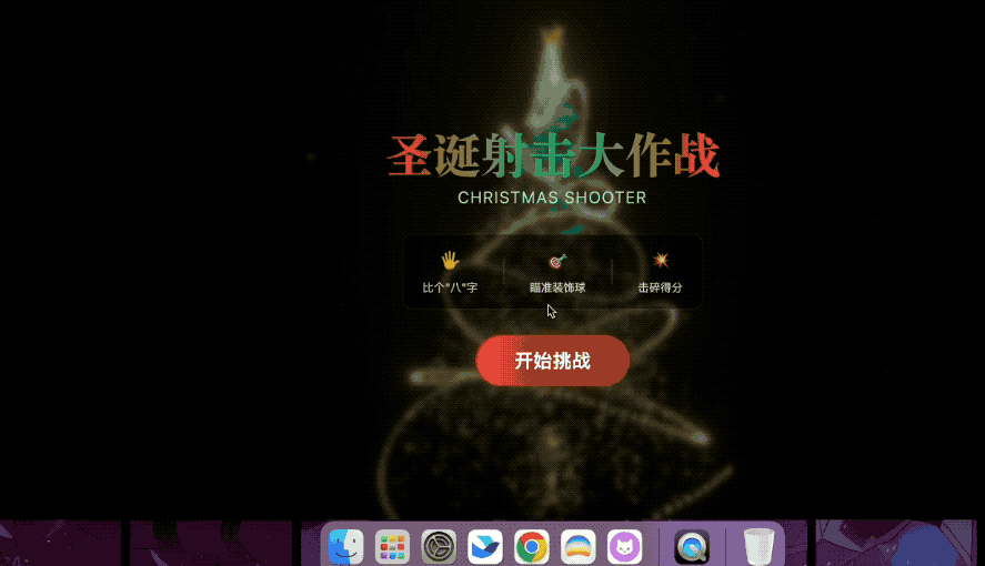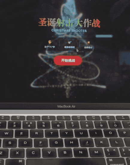 把聖誕樹改成射擊遊戲,增加蘋果和裝飾球,調用攝像頭識別手勢。當做出手槍手勢時,手指方向發射光束。如果擊中蘋果就炸裂成粒子消失,並播放音效。