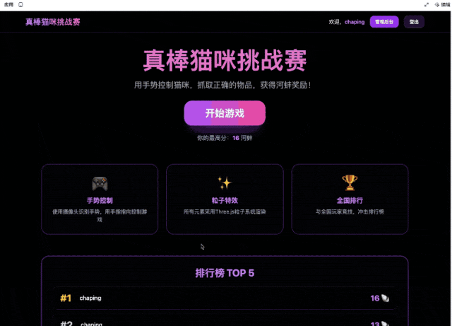 畫面最上面是一個小貓,跟隨攝像頭,手指指向左邊,小貓抓左側物品,指向右邊時抓右側物品。物品包括紙巾、蘿蔔、老鼠。上方爲倒計時和物品名,玩家手指指向正確,則提示“真棒!”,如指向錯誤則遊戲結束。結算獲得的真棒個數。
