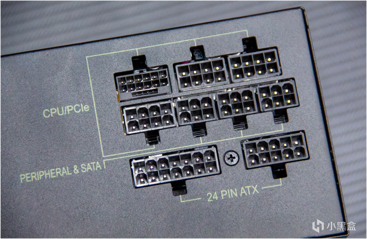 模組端接口方面,提供了一個主板24pin供電接口、三個6pinSATA接口、三個8pin CPU和顯卡PCIE接口,還有一個16pin的PCIE5.1接口。