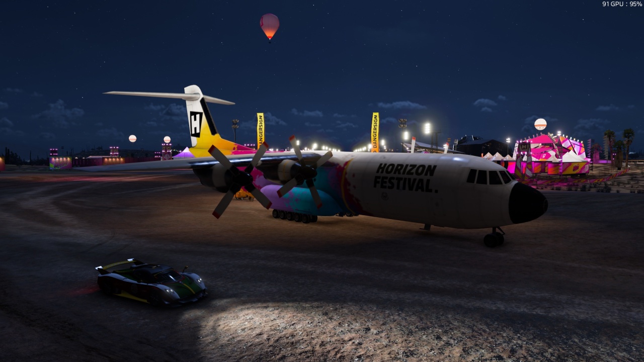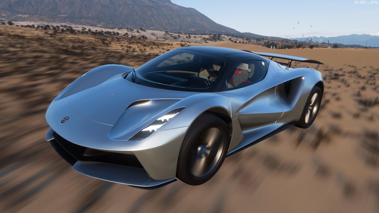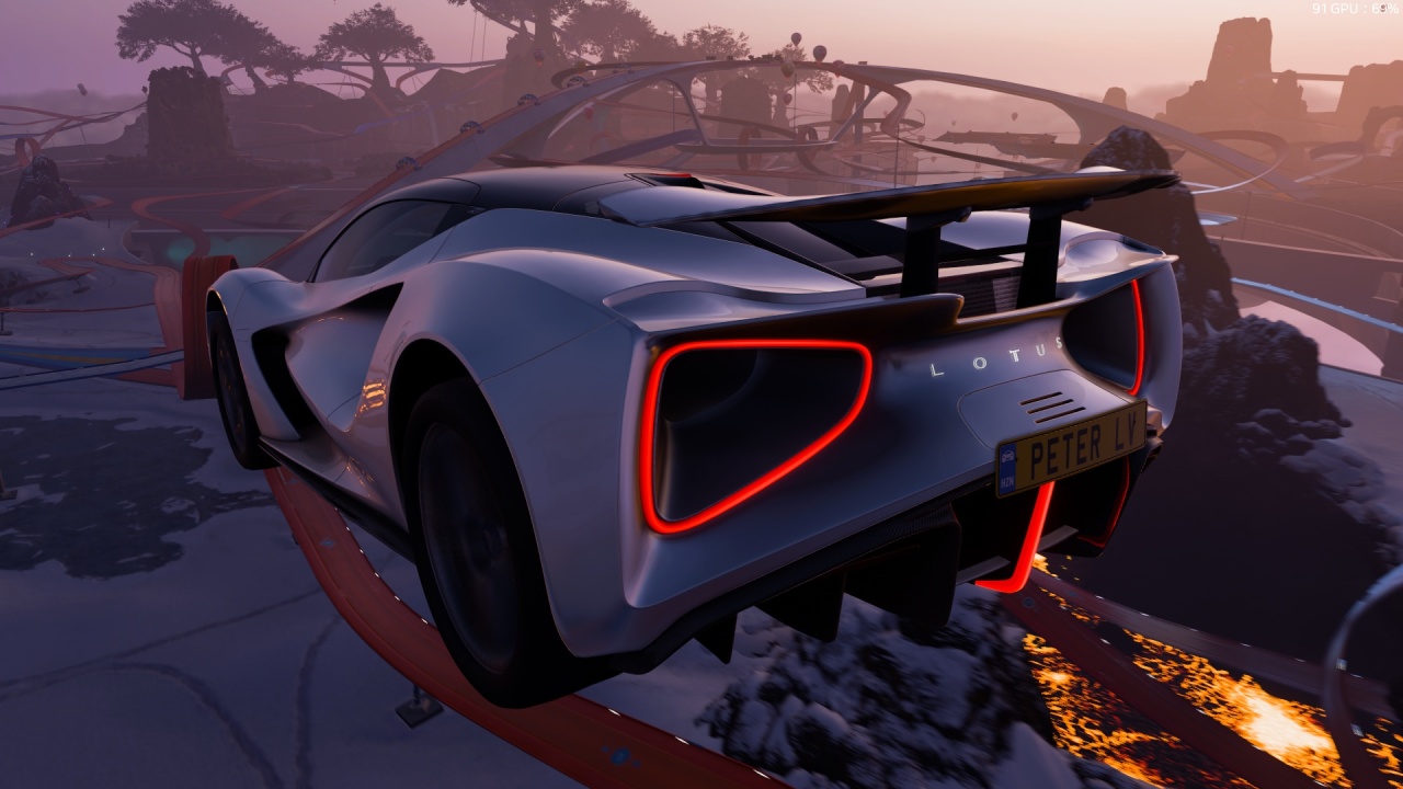 還是沿用路特斯Evija,大致起步位置如圖,沒什麼難度的一個危險標誌。爲聖誕特技之旅畫上一個完美的句號吧,可以多蓄點力沖沖紀錄,或享受在高空中翱翔、俯視風火輪公園美景的快感。