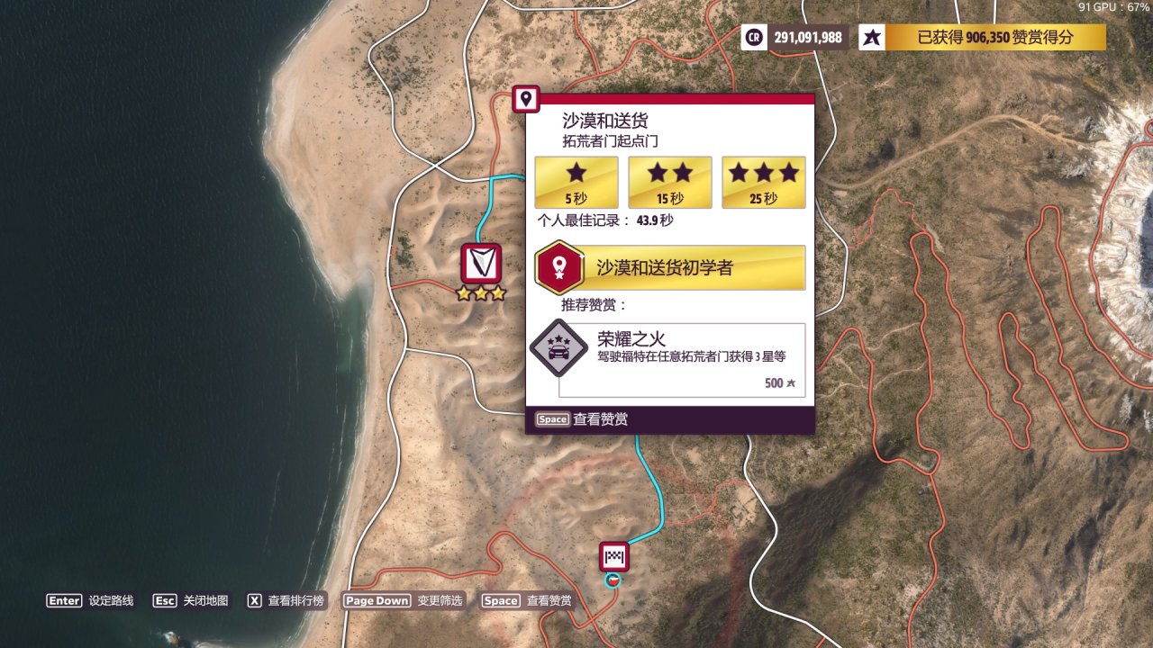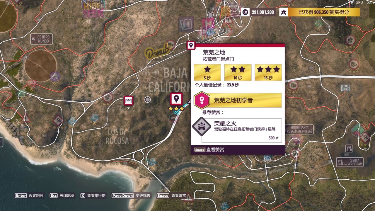 要求在白色沙丘達成一次燒胎技術。白色沙丘大致位置如圖,地圖西側這一大片看起來有起伏的沙漠都算;燒胎技術就是畫甜甜圈/原地spin/輪胎空轉,起步全油+向左/右持續打方向使車輛像陀螺一樣自轉,或者大馬力車輛正常全油起步輪胎空轉。說這麼多其實沒必要單獨去考慮的,建議和這周的拓荒者門特技一起做,Evija正常起步就達成燒胎了(