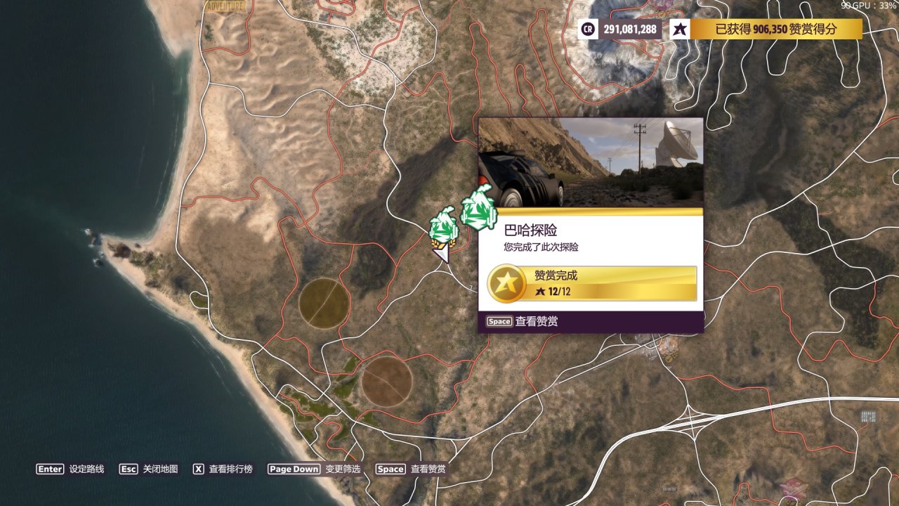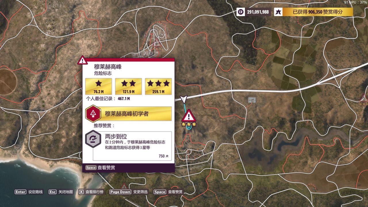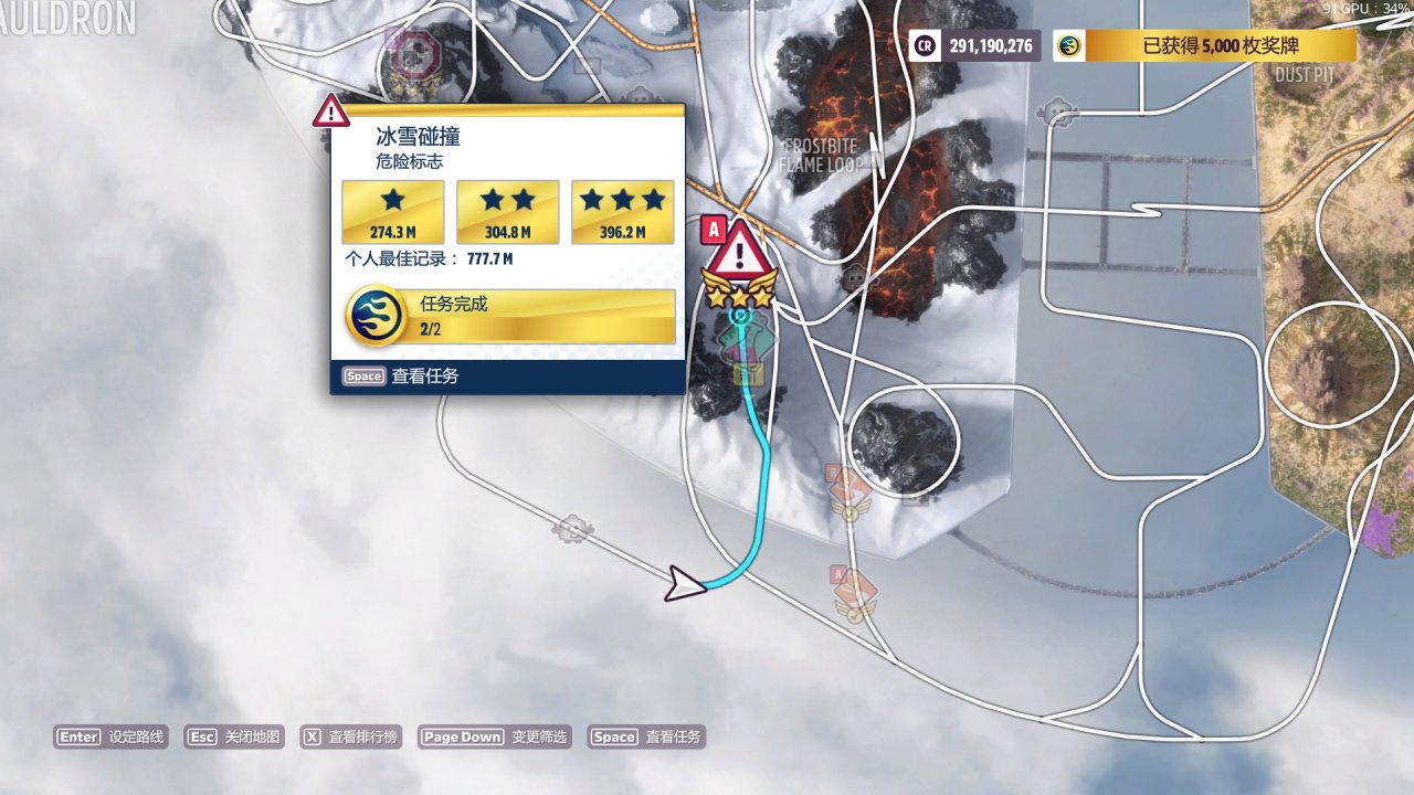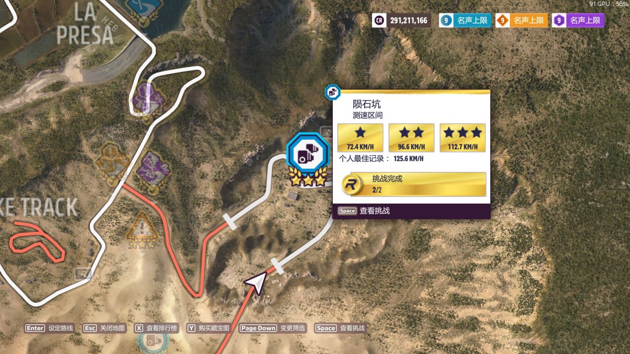 餘量依舊非常大,但是路線偏離的判定比較嚴所以很容易因爲切彎切太多或者沒拐過來衝出路線而判定失敗,注意走線的細節儘量沿着泥路走,或者在中後部的左彎處剎點車,基本只要不“失敗”就能“成功”過。推薦從南部起步,利用下坡的加速優勢會更快一點。真過不去的話我也沒招了,S2 CLK的成績也打不過Evija的,這是個全油靠加速的區間。