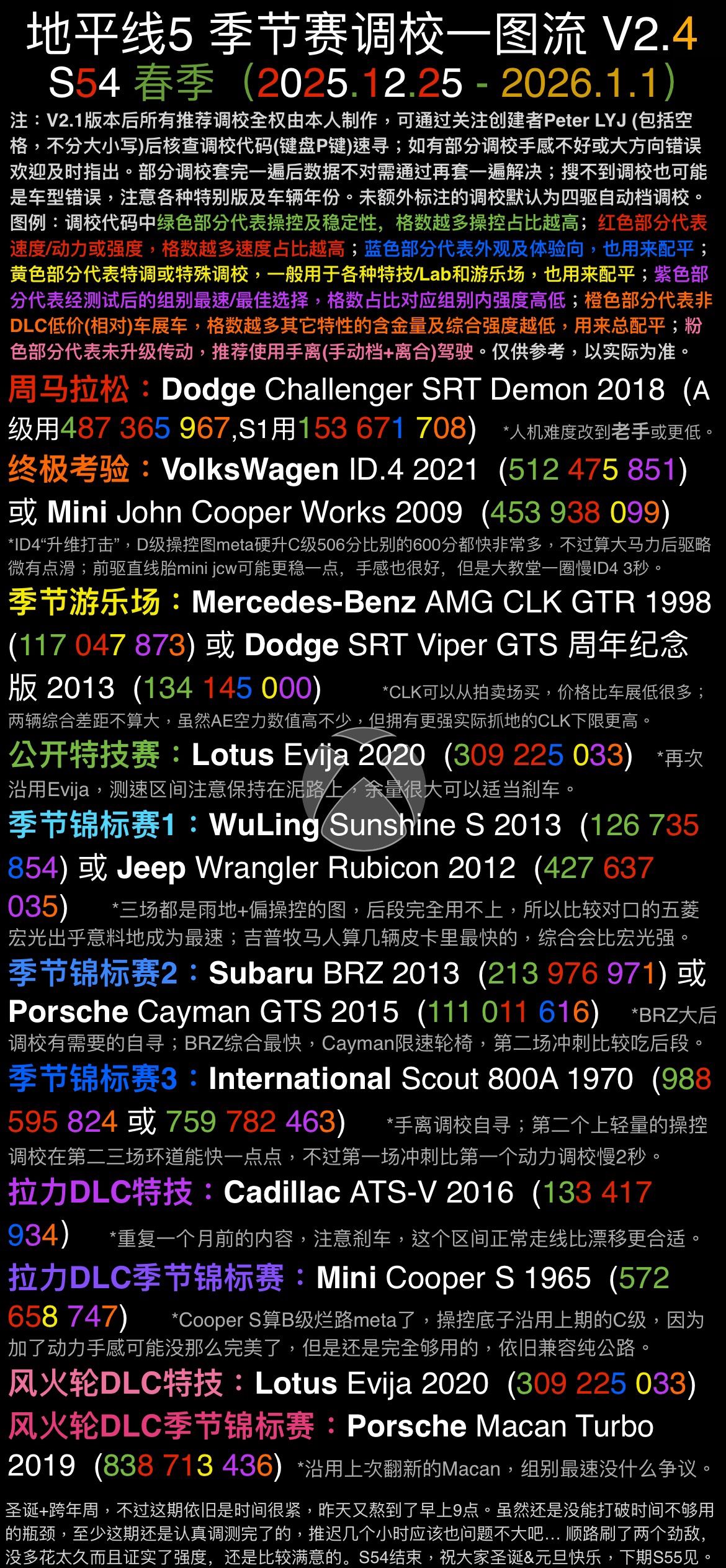 頭一回寫到這麼晚,第一次卡黑屏上傳的進度纔到錦標賽1,到現在5點多,還是不由自主地寫太長了。聖誕已至,祝大家聖誕節快樂,也希望大家都能享受2025年的這最後一期季節賽。下一季S55可能就沒啥好玩的了,兩邊的“老賽季”連我也都完成過,有點太新了… 當然重複內容多對我來說也算是省力了,可以多挑幾輛有趣的車出來,也能省下更多時間休息調整了。展望2026,地平線6會在這一年發佈,到時候大概率會暫時放棄5代去“開發”6代了,希望日本之旅不要帶來太多失望吧。個人的承受能力還是挺高的,祖傳空力套件什麼的不改也問題不大,別把調校系統搞得太抽象或者給遊樂場模式砍沒了就行。暫時想不起來別的想說的東西了,先這樣吧,2026見。