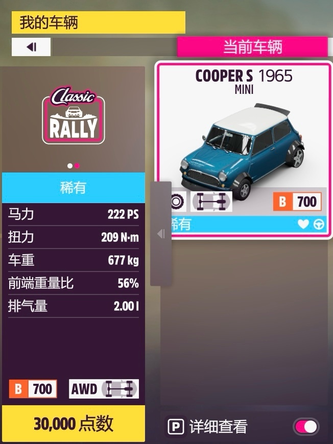 也是相當沒懸念的一個組別,提到mini大家最先想到的肯定是這輛經典的Cooper S了。在B級爛路有着meta級強度的小車跑拉力dlc肯定也是mini中的最速,底子沿用上期的C級,基本沒升操控而加了點動力,所以手感可能沒那麼完美了,但是操控還是完全夠用的,也照樣能跑純公路不怕被PG陰。雖然車身小而輕,這輛Cooper S的對抗性可能沒有看起來那麼弱,更強的抓地力使得它更難被撞離路線,較高空力的底褲也讓它並沒有那麼容易spin,再加上足以輕鬆避開碰撞的靈活性,實戰不會喫多少虧。不過車身小也就不太能想當然地蹭點了,注意把控方向不要過度或過早內切。