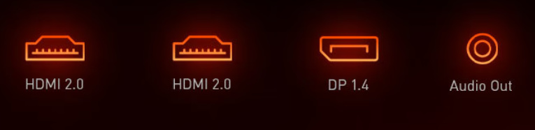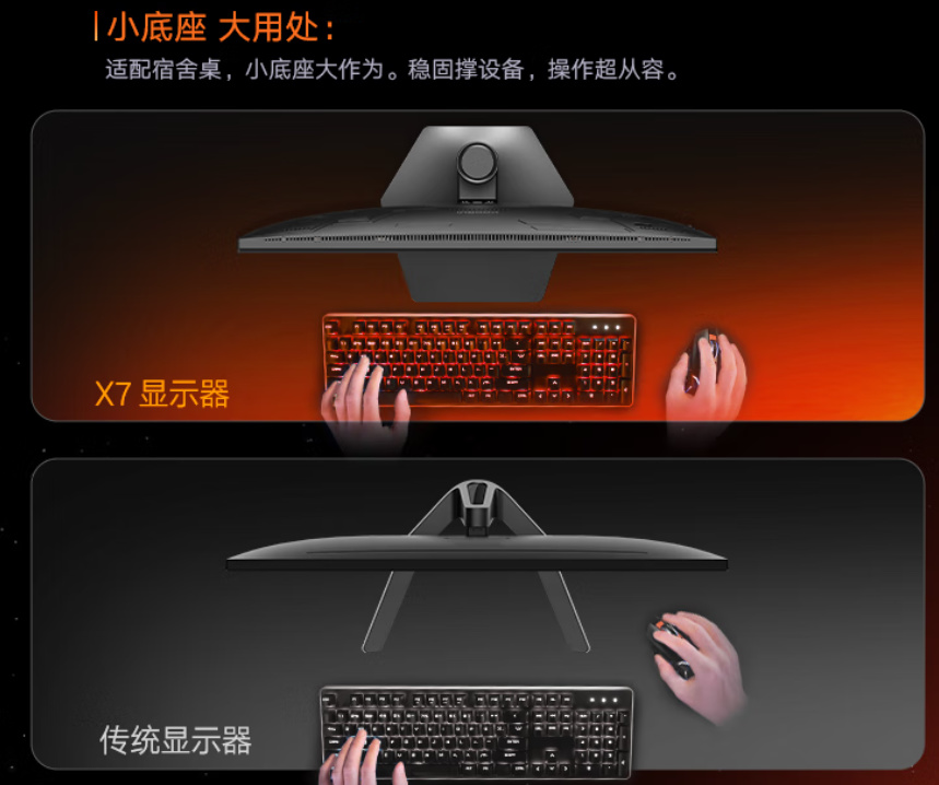 採用小底座設計,佔桌面積比八字底座更小,鍵鼠設備空間更大,插口爲雙HDMI2.0 + DP1.4 + 3.5mm音頻口。