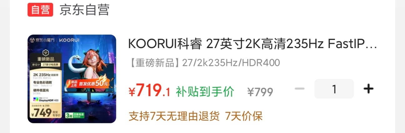 科睿X7,27寸2K 235Hz高刷屏幕上新,某東實際719元到手,同配置價格最低,雖然是萬金油選擇,但最適合側重單機的玩家!