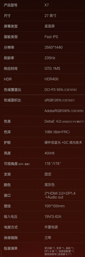 科睿X7色彩能達到95% DCI-P3廣色域與126% sRGB色域,支持10Bit色深(8bit+FRC),出廠ΔE≤2,色彩還原精準,玩3A和看影視觀感應該很棒。