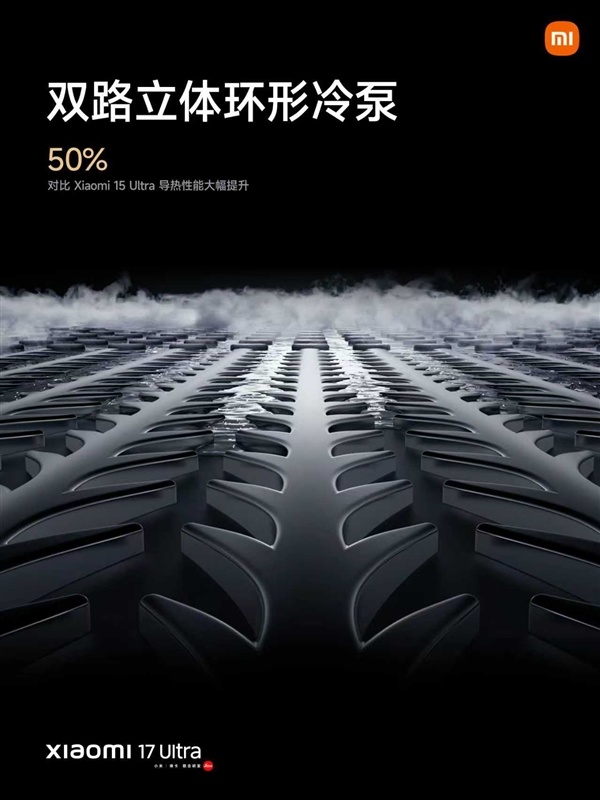 散熱採用雙路立體環形冷泵,對比上代小米15 Ultra導熱性能大幅提升50%,在人像模式連拍150張的情況下,拍攝速度比iPhone 17 Pro MAX快29秒,平均溫度低2.2°C。