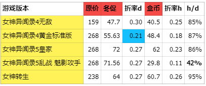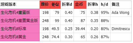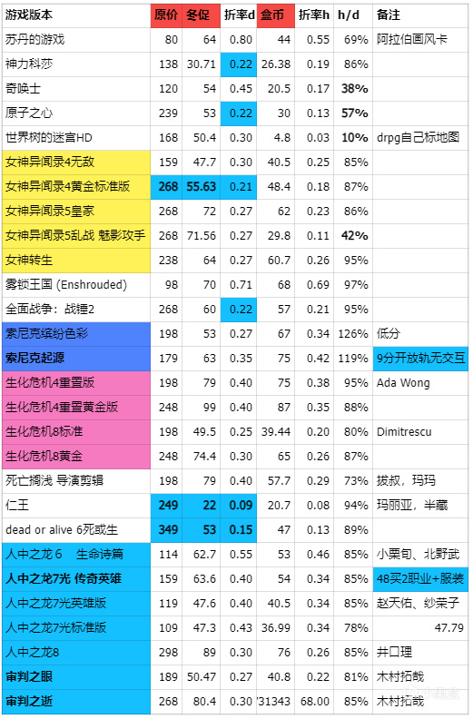 下面第一張完整表,紅色3列是原價/冬促價/盒幣價,篩選的是比較熱銷的50元以上產品,當時篩選的標準是本體折後超過50元(能用券),折扣在3折以下超值,碰到系列不同版本也列出標準/升級/豪華版本的價格(部分低於40元)
