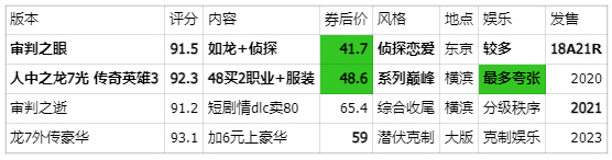 目前好價是龍7正傳,全套打包券後48,以及審判之眼。他們伴隨的兩部:龍7外傳和審判之逝,就有點挑人了,改動創新也不是所有老玩家都能適應。對於收藏情懷來說,四部+龍6都是低價好時機。