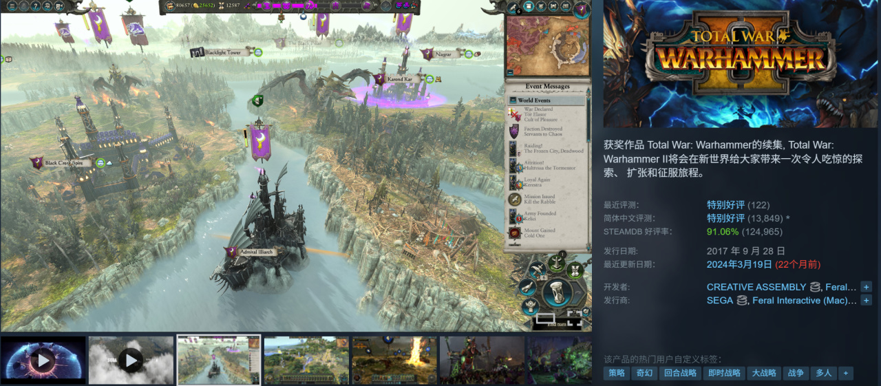全面戰爭:戰錘2擁有91%好評(IGN也給的9.1分),奇幻史詩冒險,畫風細膩的回合戰略,只是paradox家之前那幾款我玩膩了,這款本身是沒什麼問題的。