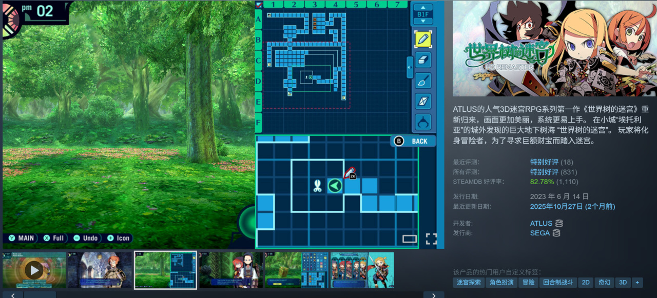 世界樹的迷宮HD值率10%,這個是古早的地宮偵探DRPG,原版要自己畫地圖,這個重製版簡化爲自動畫路線,但可以保留很多自己的記號,亮點就是你探索的過程中有許多參與感,甚至有點星際爭霸開迷霧的感受,打完之後成就感更滿。低情商:復古肝帝,高情商:點滴共建。復古收藏還是很不錯。開發者ATLUS其他作品有《真女神轉生》《女神異聞錄》,這兩部進入了第三回合,在那裏詳細說說。