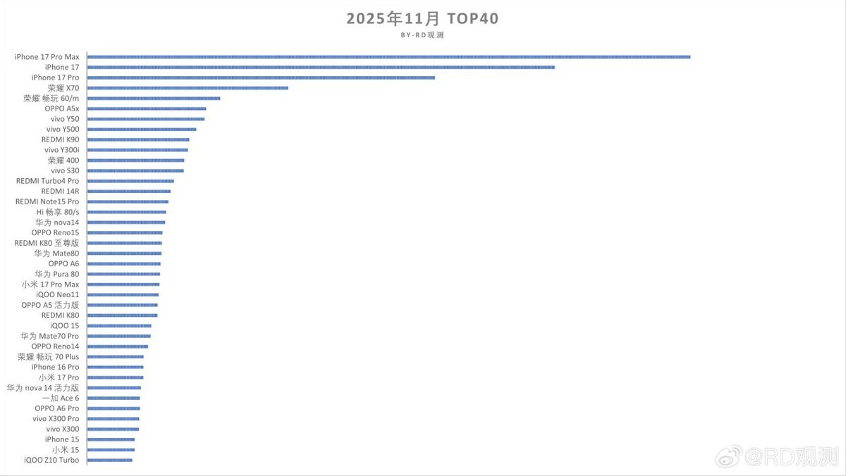2025年11月單機銷量榜,蘋果iPhone17系列3款機型霸榜前三,ProMax第一,17第二,17Pro第三。國產高端手機這塊,除了華爲mate80,還有華爲Pura80、小米17ProMax和華爲mate70Pro共4款國產高端手機進入前30,華爲一家獨佔3款,展示了華爲在高端手機領域的絕對實力,可以說國內高端手機市場,只有華爲有實力與蘋果一戰,國產安卓目前還成不了氣候。