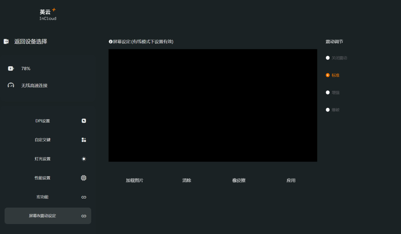 震動模式在驅動上是可調節的。分爲標準,增強和爆破三檔,建議標準檔,如果用增強和爆破模式的話,強度會比較大,所以標準模式就挺好。當然如果不需要震動,也可以關閉。