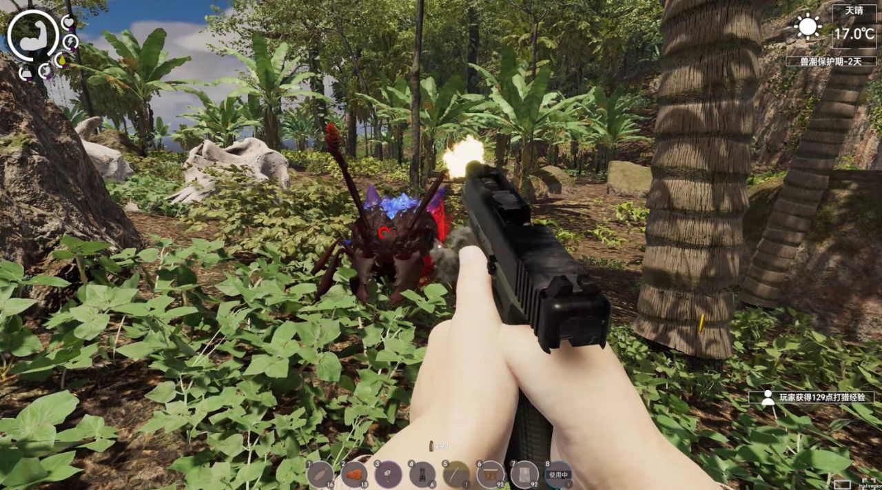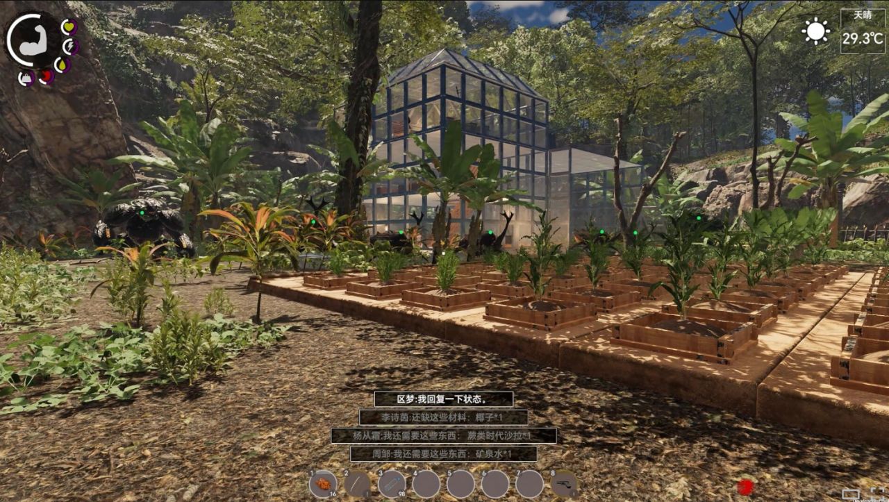 生存建造系统:地图涵盖丛林、洞穴、山崖等多地形,几乎所有场景物件均可采集利用。玩家需管理饥渴度、建造基地、种植渔获,同时应对极端天气与变异生物威胁,平衡生存压力与资源管理。