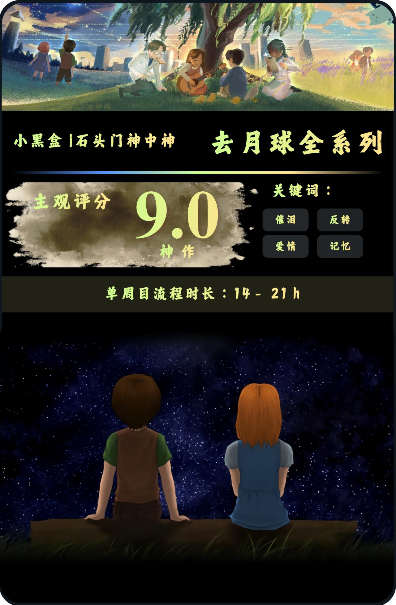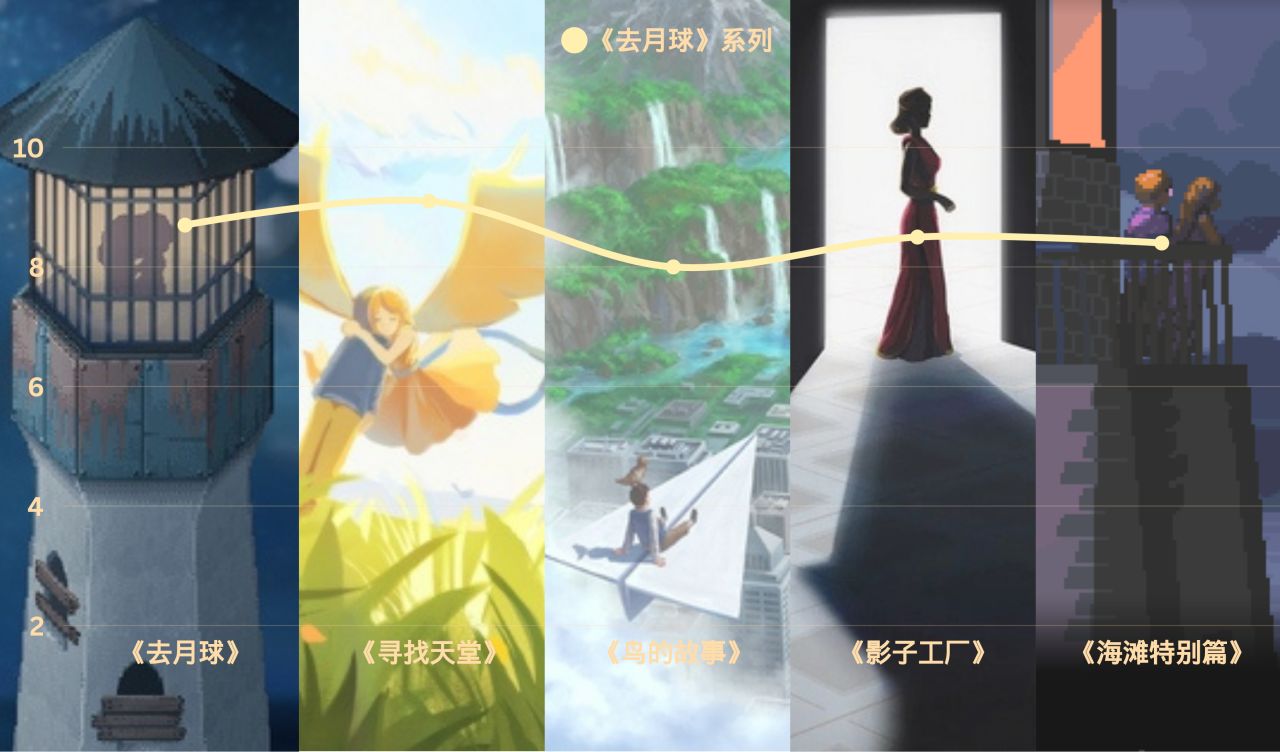 推荐游玩顺序:《去月球》 - 《寻找天堂》 - 《鸟的故事》(外传性质,建议放在《寻找天堂》之后) - 《影子工厂》 - 《去月球:海滩特别篇》 - 《去月球 Last Hour RPG》(未发售)