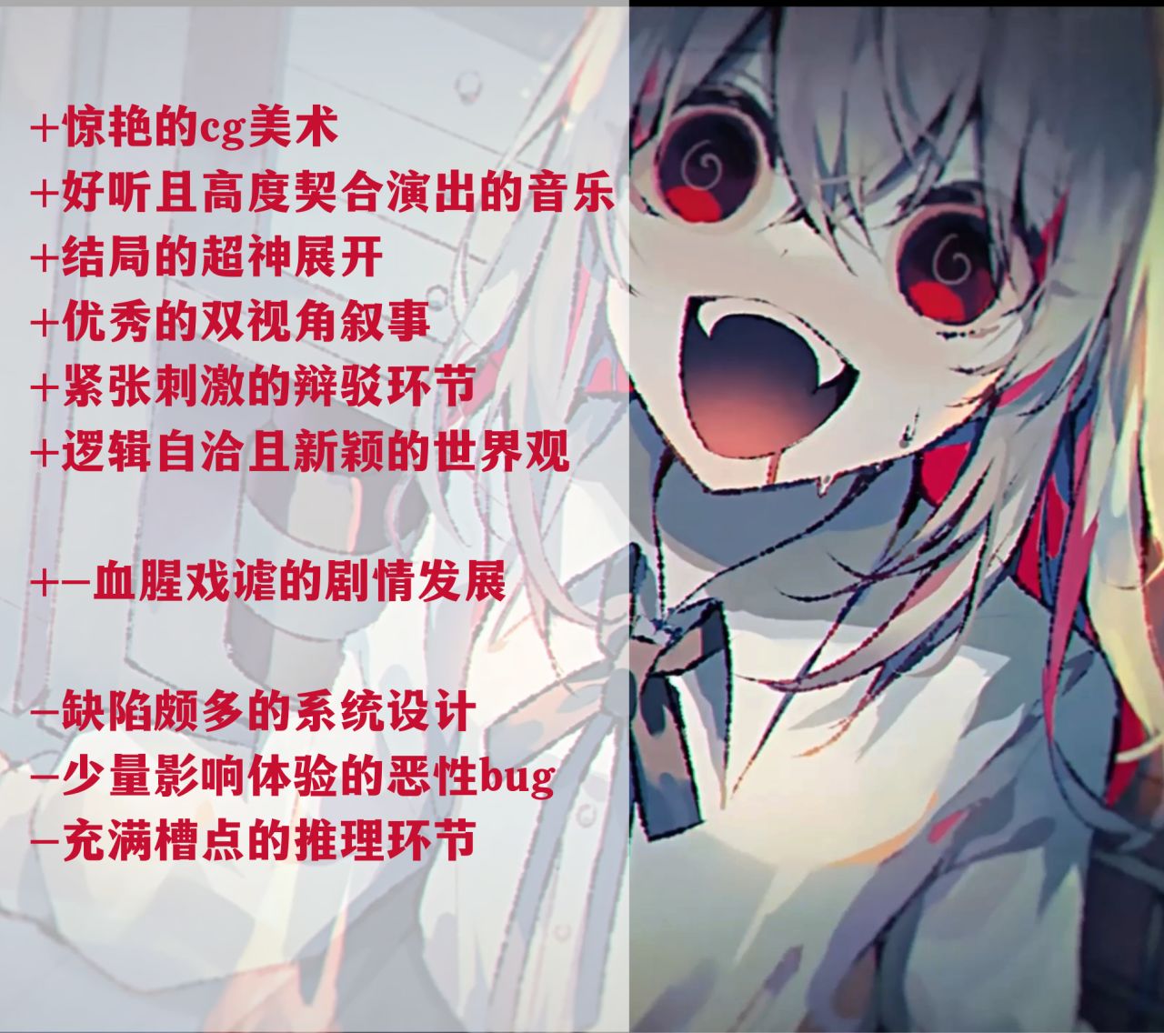 最后强调一点,只要你是对本作的人设,噱头,或者背景设定稍微有点感兴趣的,都可以无脑入。但如果你是奔着推理来的,需要谨慎看待,因为它的推理部分并不算出色,更多的是一种诡辩智斗。