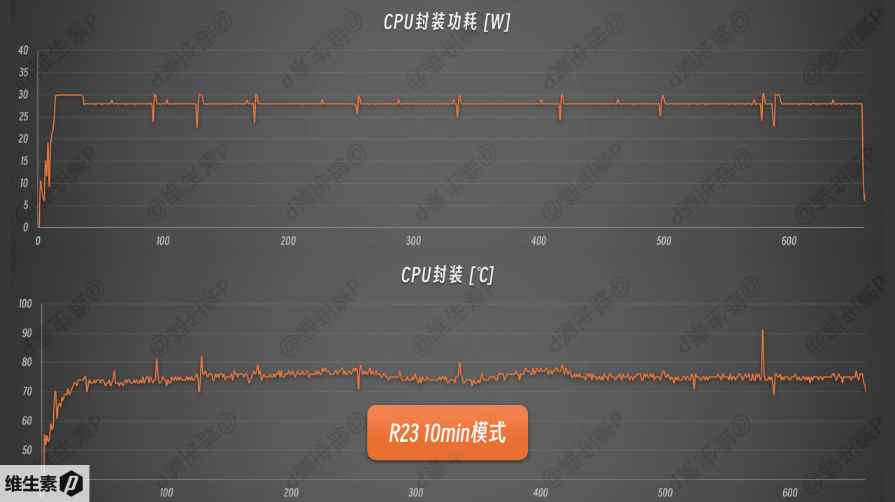 记录 R23 跑分 10 分钟模式下的功耗,可以看到瞬时功耗最大 30W, 长时稳定功耗在 28W,属于轻薄本较为保守的水平。