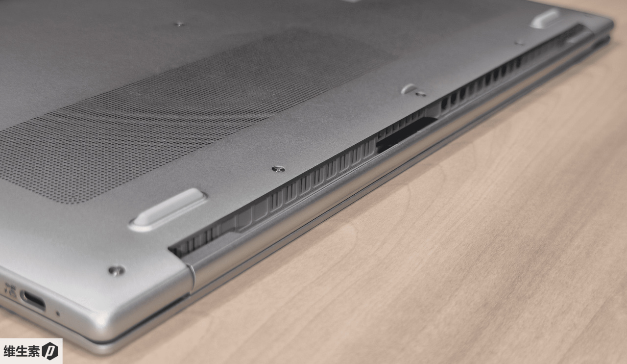 底壳采用铝合金材质,有四个脚垫以及一排细孔的进风口,出风口隐藏在屏轴位置。