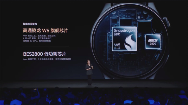 其他的配置方面,为了凸显这个旗舰的定位,小米给 Watch 5 用上了双芯片的架构,一块是高通的骁龙 W5 ( 第一代 ),另一个是低功耗的恒玄的 BES2800 。这样一来,在需要渲染能力的时候骁龙能顶的上,需要续航的时候恒玄也稳得住。
