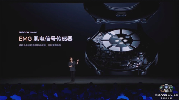 和 Apple Watch 不太一样的点在于,小米 Watch 5 实现手势控制的方式是在表背上加了一个 “ EMG 肌电信号传感器 ” ,用来捕捉肌电信号,从而实现更精细的手势控制。