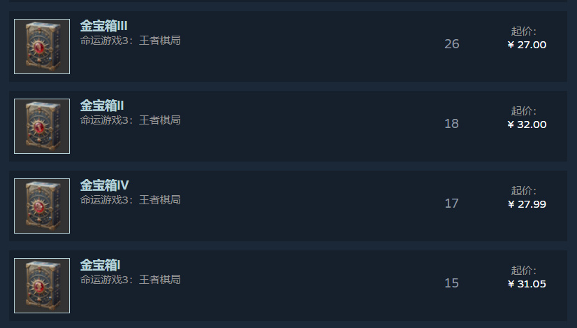 下图是目前《命运游戏3》的金箱子是Steam市场上的价格情况,可以看出确实很诱人,出了一个就能“回血”二十多块钱,早期的金箱子价格就是这么美丽,后面会逐渐下滑,所以尽快拿到通关保送的金箱子然后卖掉吧,后续每16小时的那个就不急了。总之记住一句话——咱们就是靠卖金箱子“回血”。