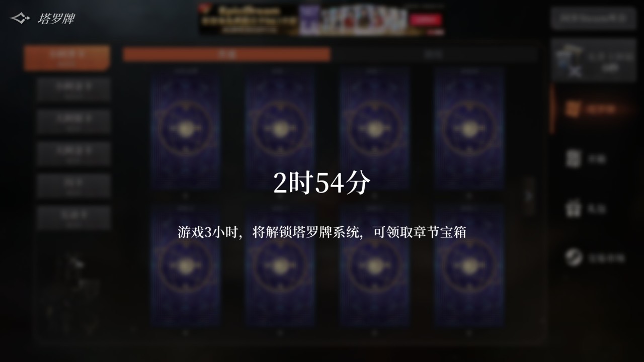 先让游戏时长达到3小时,这样才能开启塔罗牌系统。这个时长3小时是你打开游戏之后就开始计时,关闭游戏就会终止的。所以你如果在入手游戏的第一时间没空玩,那你打开游戏挂机也可以增加时长,时长够3小时之后就能开启塔罗牌系统了。然后就是尽快通关一次游戏,首次通关系统会保送一个金箱子。