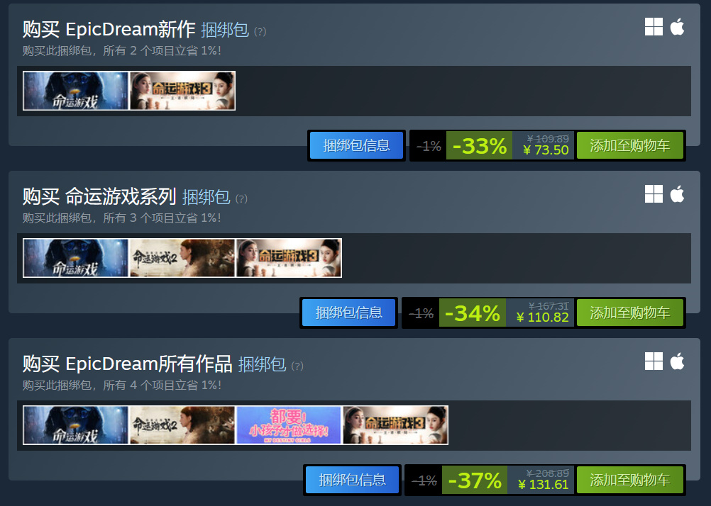 上图即为《命运游戏3》相关的三个捆绑包。以上图的顺序来介绍,分别简称其为1号、2号、3号包。
