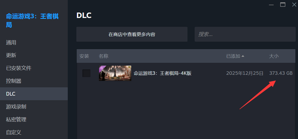 《命运游戏3》游戏本体容量有将近86个G之巨,比市面上绝大多数互动影游都要大很多,可以看出其内容体量确实不容小觑。如果你想享受4K高清画质,那么就要安装之前提到的免费DLC,加起来有将近460G哦!所以如果你想快点玩的话,个人建议先安装本体玩起来再说。