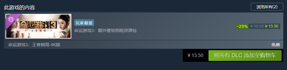 免费DLC《命运游戏3:王者棋局-4K版》则是让你在购买本体后可以下载4K高清视频。因为是免费的,所以入手本体之后记得领取。