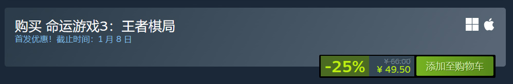 A:《命运游戏3:王者棋局》的首发售价为49.5元。此为-25%OFF首发优惠的折后价。首发优惠截止时间为1月8日。