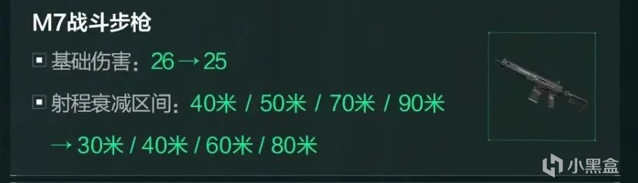 在上次的季中调整,M7可谓是被大砍了一波,基础伤害从26降到25,打头伤害随之降到47。优势射程更是被砍了10m,40被砍到30m。这波确实是让M7降低了统治力,对中远距离的杀伤力影响很大。