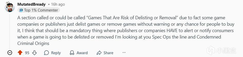 鉴于一些游戏公司或发行商会在没有任何警告或购买机会的情况下,直接下架或移除游戏,因此,我认为应该设立一个名为“面临下架或移除风险的游戏”的版块。发行商或公司必须在游戏即将下架或移除时通知消费者,这应该成为一项强制性规定。