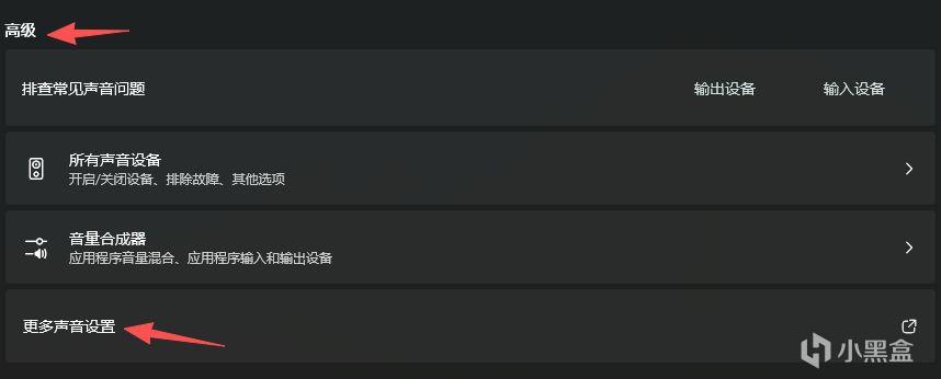 還有一步更進階的設置,大家可以按照自己的需求調節。同樣是進入“聲音設置”,下拉來到“高級”部分,點擊“更多聲音設置”: